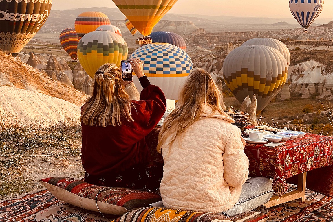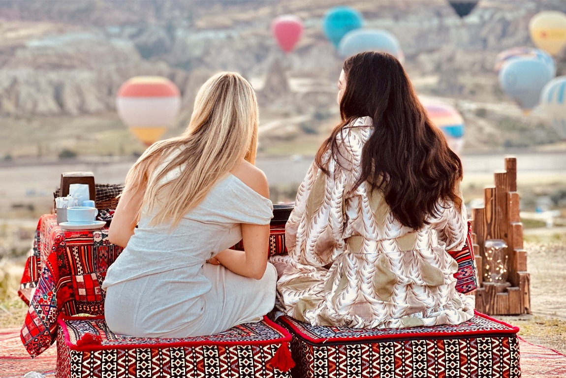 Dine amidst the mystical valleys of Cappadocia, accompanied by the magical sight of hot air balloons.